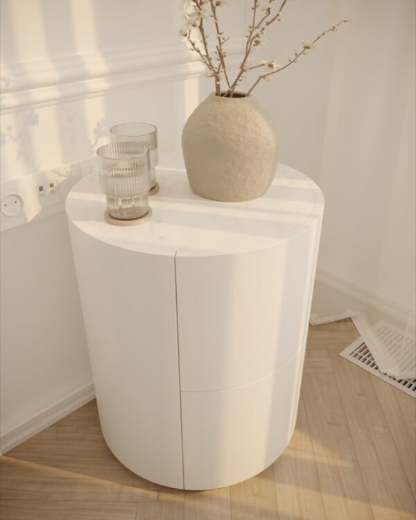 Прикроватная тумба Bumble привлекает внимание своей компактностью и продуманной конструкцией, которая включает два вместительных отделения с удобными ящиками. Элегантная круглая форма придаёт изделию современный и изящный облик, позволяя гармонично вписаться в любой интерьер. Практичный и функциональный дизайн обеспечивает комфорт в использовании и предлагает достаточно пространства для хранения всех необходимых мелочей, создавая уют и порядок в вашем доме.
