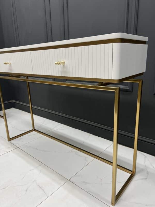 Шикарный консольный стол «Caesar» прекрасно впишется в любой интерьер и станет её изюминкой за счёт эффектной фрезеровки на фасадах, мягкими закруглениями по бокам, и с металлическими ножками.